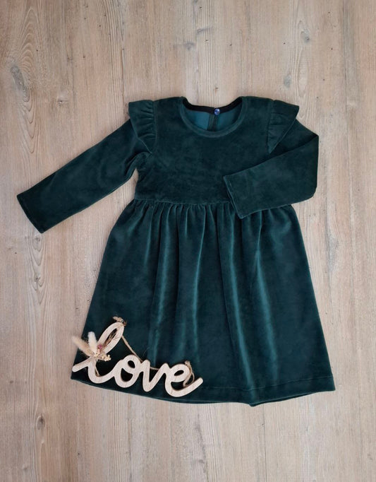 Mädchen Kleid aus Nicki-Stoff in Smaragdgrün – mit langen Ärmeln & Rüschen am Oberarm – Größe 68–122
