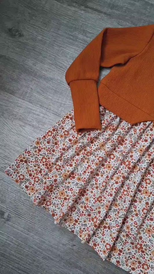 Mädchenkleid aus Waffelstrick- Jersey– handgemacht –Terrakotta - Blumenmuster – Größen 110–140– Kinderkleid festlich & alltagstauglich