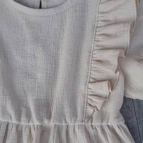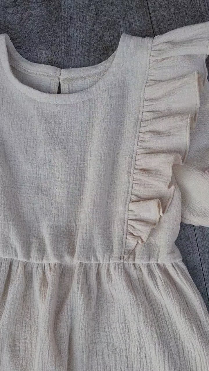 Dieses liebevoll handgefertigte Kleid aus weichem Musselin ist ein echter Hingucker – luftig, bequem und ideal für zarte Kinderhaut. Es ist in den stilvollen Farben Sand, Stahlblau, Weiß, Mittelgrau und Dunkelblau erhältlich und begeistert mit seinen verspielten Rüschen vorne und hinten, die dem Kleid eine romantische, zeitlose Note verleihen.