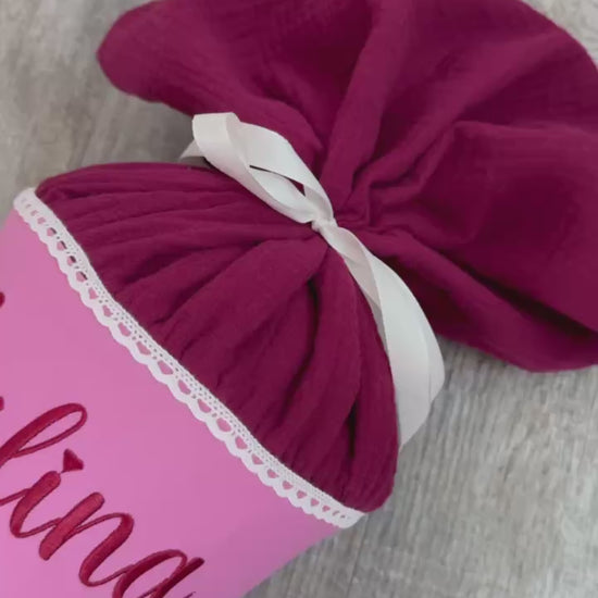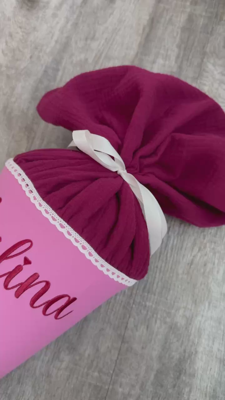 Diese hochwertige Zuckertüte aus weichem Musselin-und Popeline Stoff ist mit einem zauberhaften Einhorn, zarten Spitzen-Details und einem personalisierten Namen sowie dem Einschulungsjahr (z. B. „Schulkind 2025“) versehen.