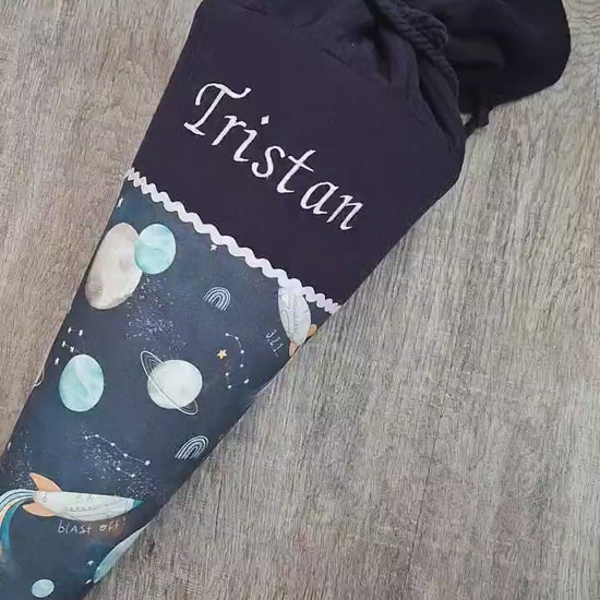 - Farben: Die Schultüte ist in einem tiefen Marineblau oder einem sanften Blau-Grau gehalten, was an die unendlichen Weiten des Weltraums erinnert. Diese Farben verleihen der Schultüte eine elegante und zugleich verspielte Note.